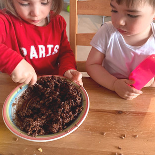 Una volta sciolto per bene il cioccolato abbiamo aggiunto i fiocchi di mais sbriciolati e il riso soffiato. Camilla ha mescolato con cura tutti gli ingredienti. Federico assaggiava i pezzetti che cadevano fuori da piatto.